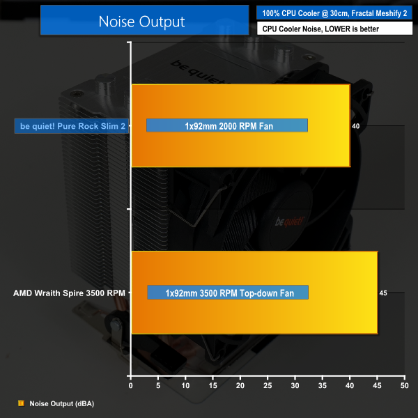 Noise output delivers another victory for the be quiet! Pure Rock Slim 2 versus AMD’s Wraith Spire cooler. Operating a single 92mm fan at 2000 RPM, it comes as no surprise that the Pure Rock Slim 2 is quieter than the 3500 RPM AMD blower.