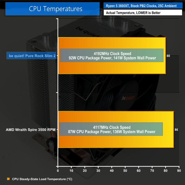 Right off the bat, we see the be quiet! Pure Rock Slim 2 showing a solid cooling performance improvement over the AMD Wraith Spire cooler.