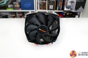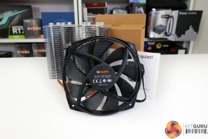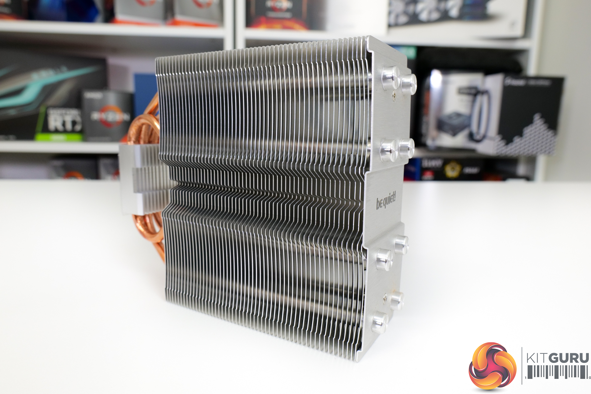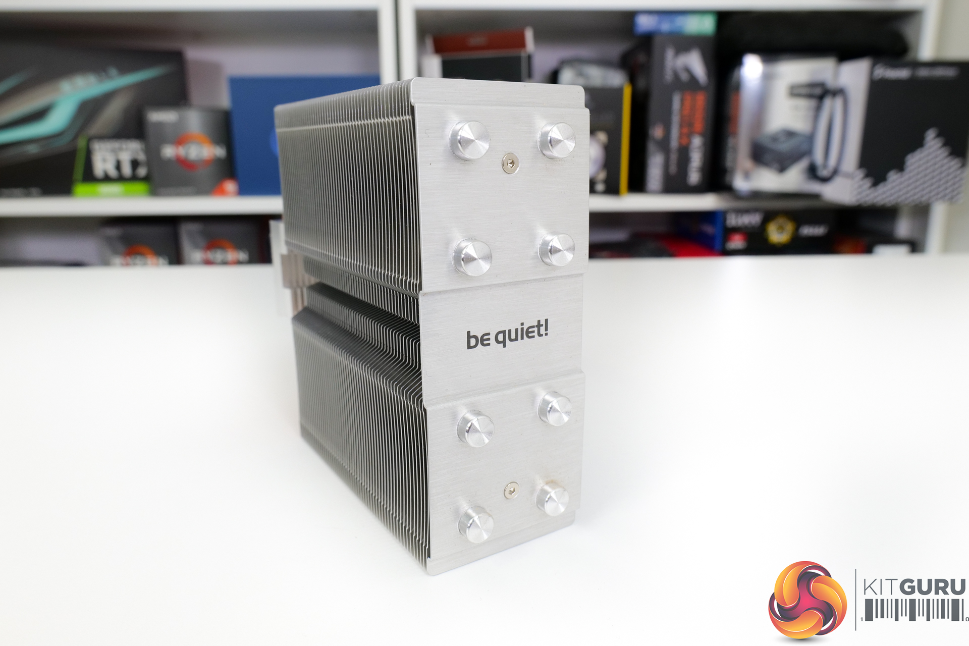 Starting out with a look at the heatsink itself, be quiet! has gone for a standard silver fin array that is typical for the company’s mid-range price point offerings. A solid top plate holds the black text be quiet! logo and 8 silver caps are used to mask the copper coloured heatpipe tops – a quality touch for aesthetic consistency.