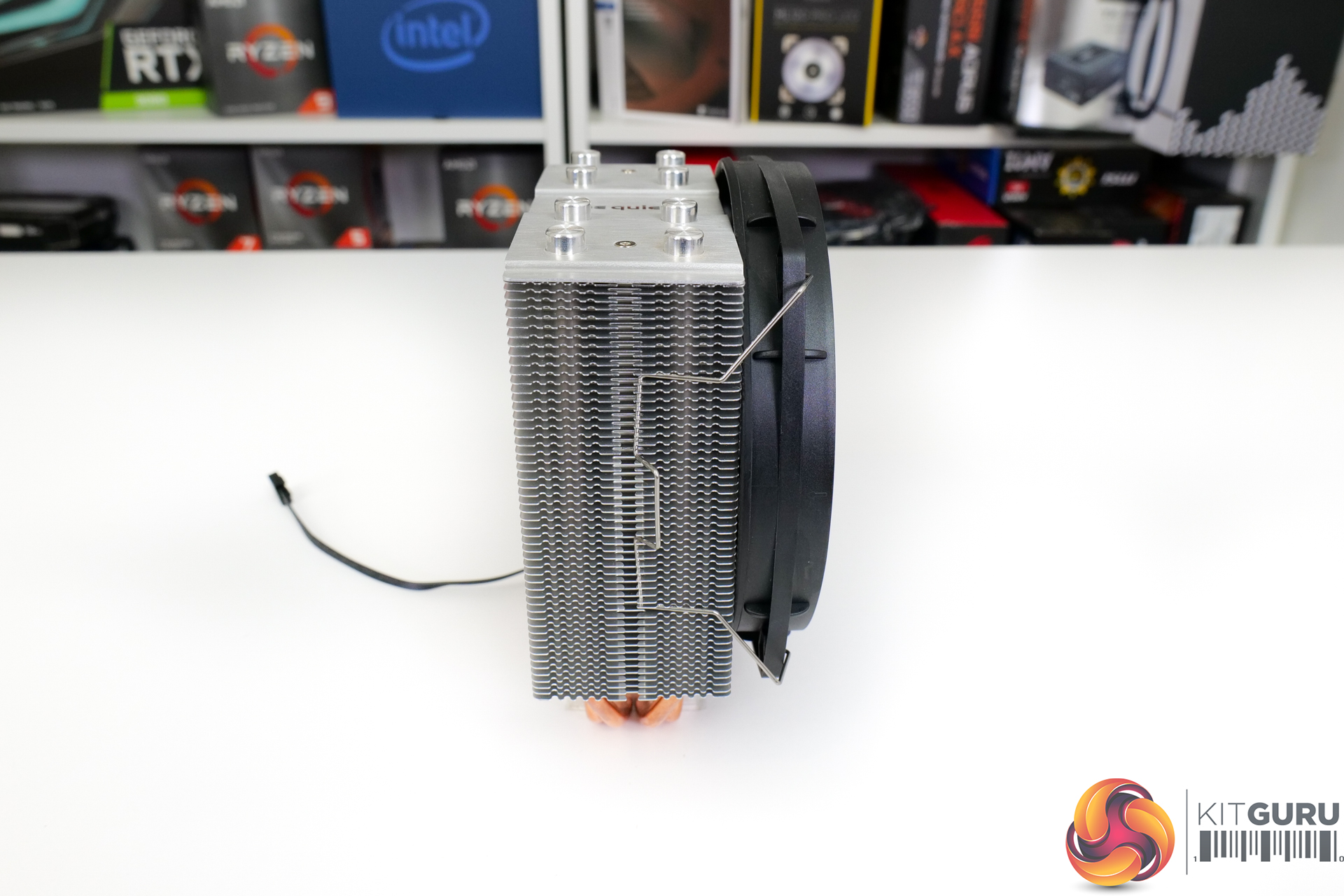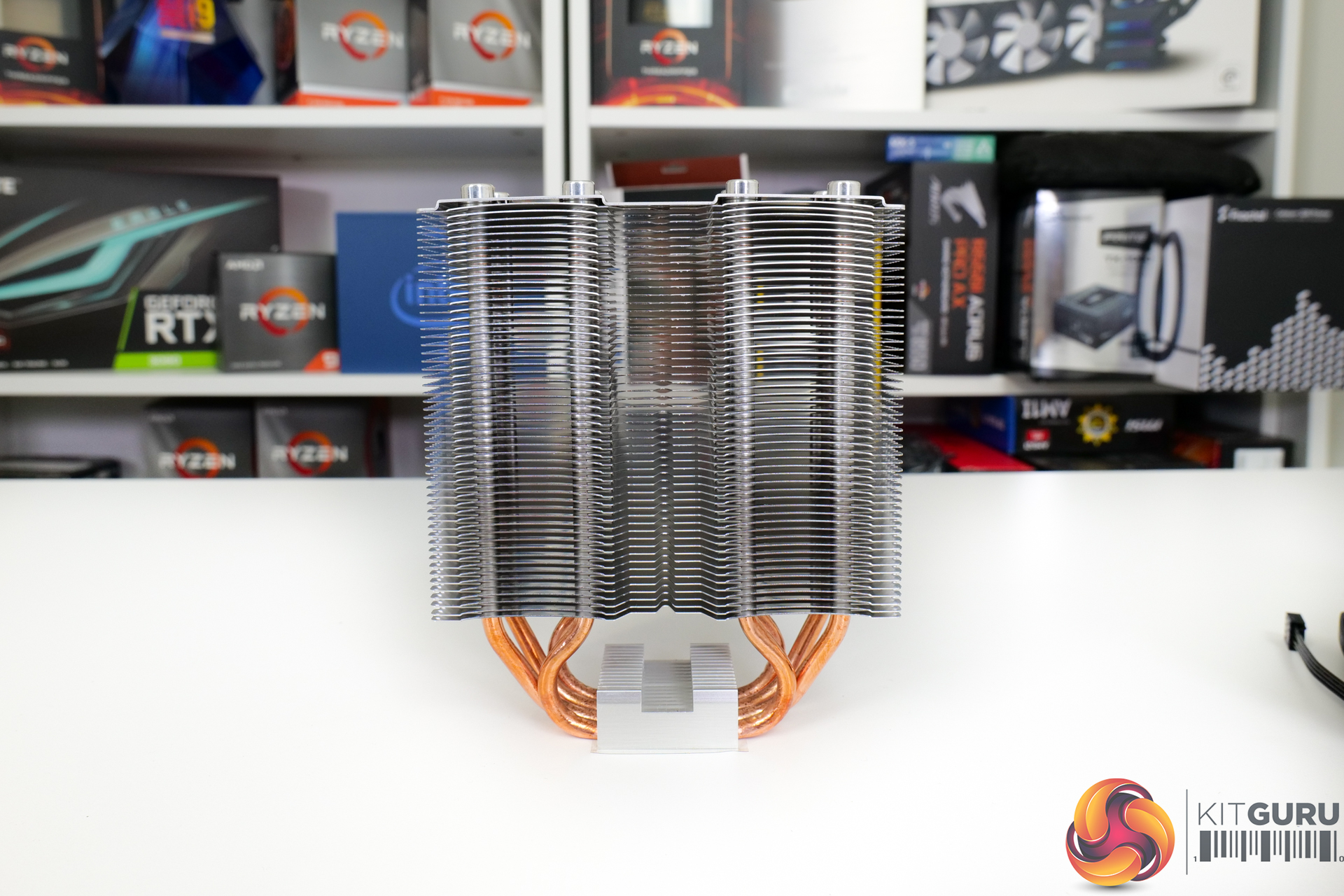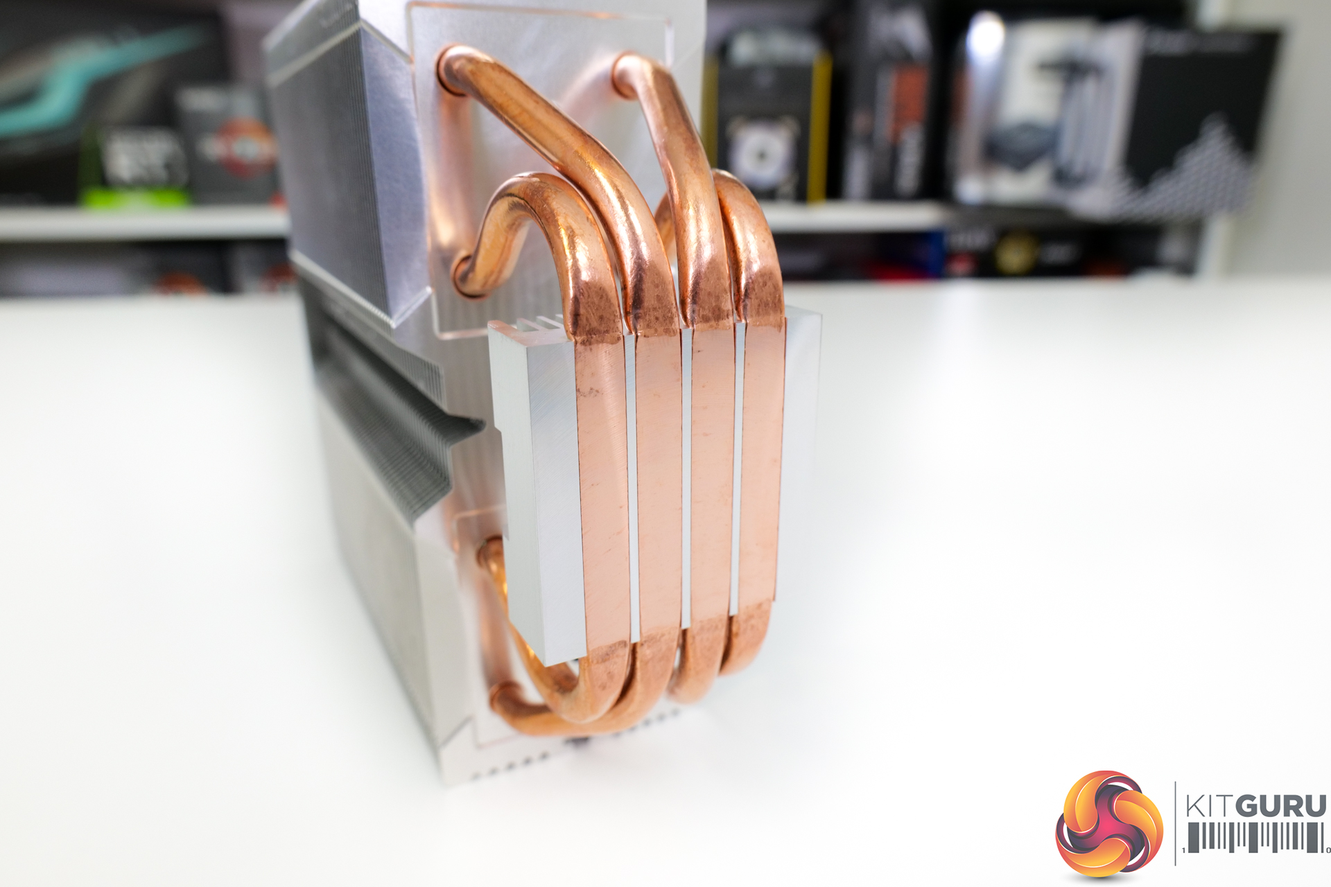 Running through the aluminium fin array are four 6mm diameter copper heatpipes that come from the Heatpipe Direct Touch (HDT) base. As we would expect from a single tower heatsink, these are mounted in a U-shaped orientation. Two heatpipes position towards the front side of the fin array, and two towards the rear – at different positions behind the fan of course.