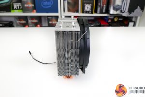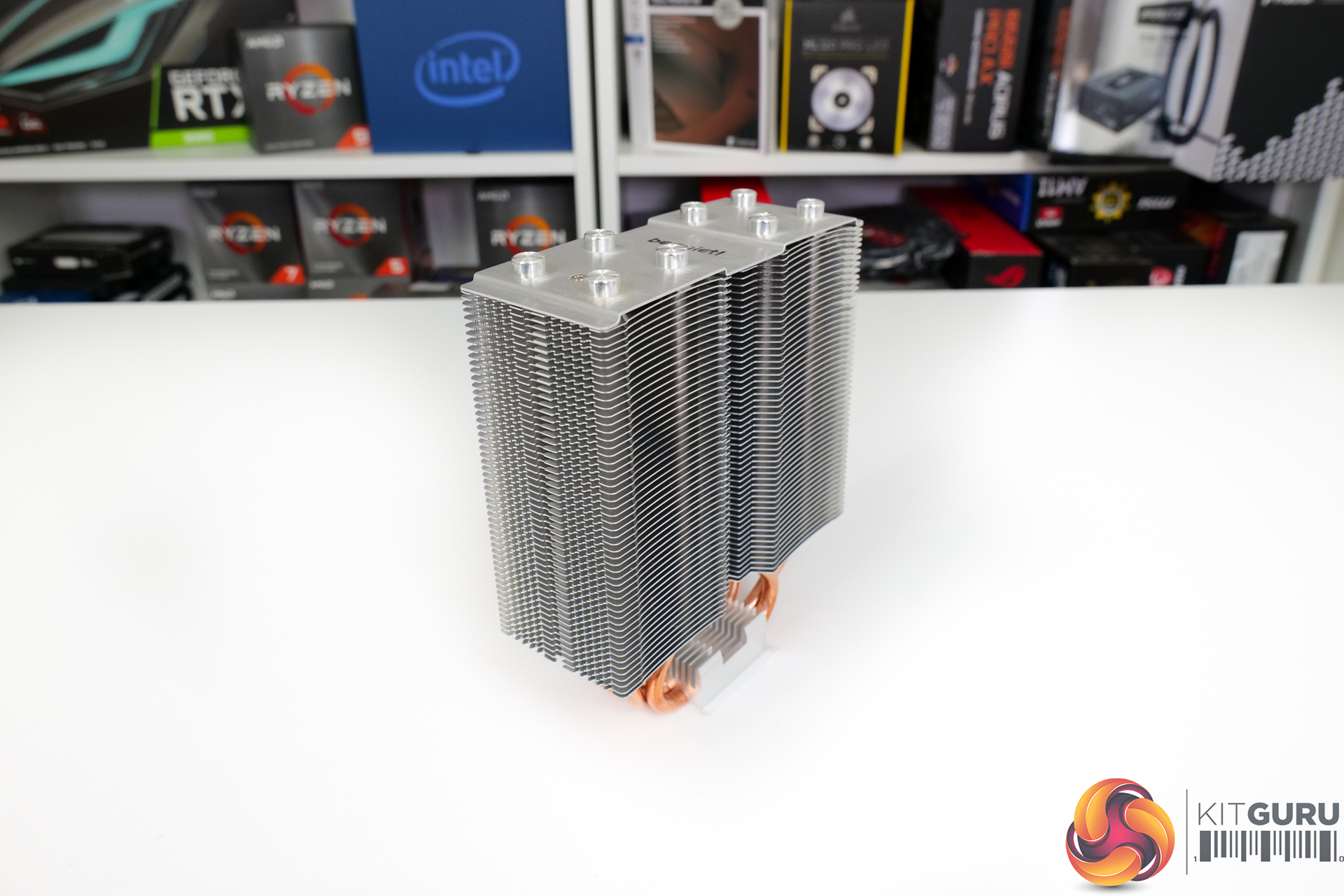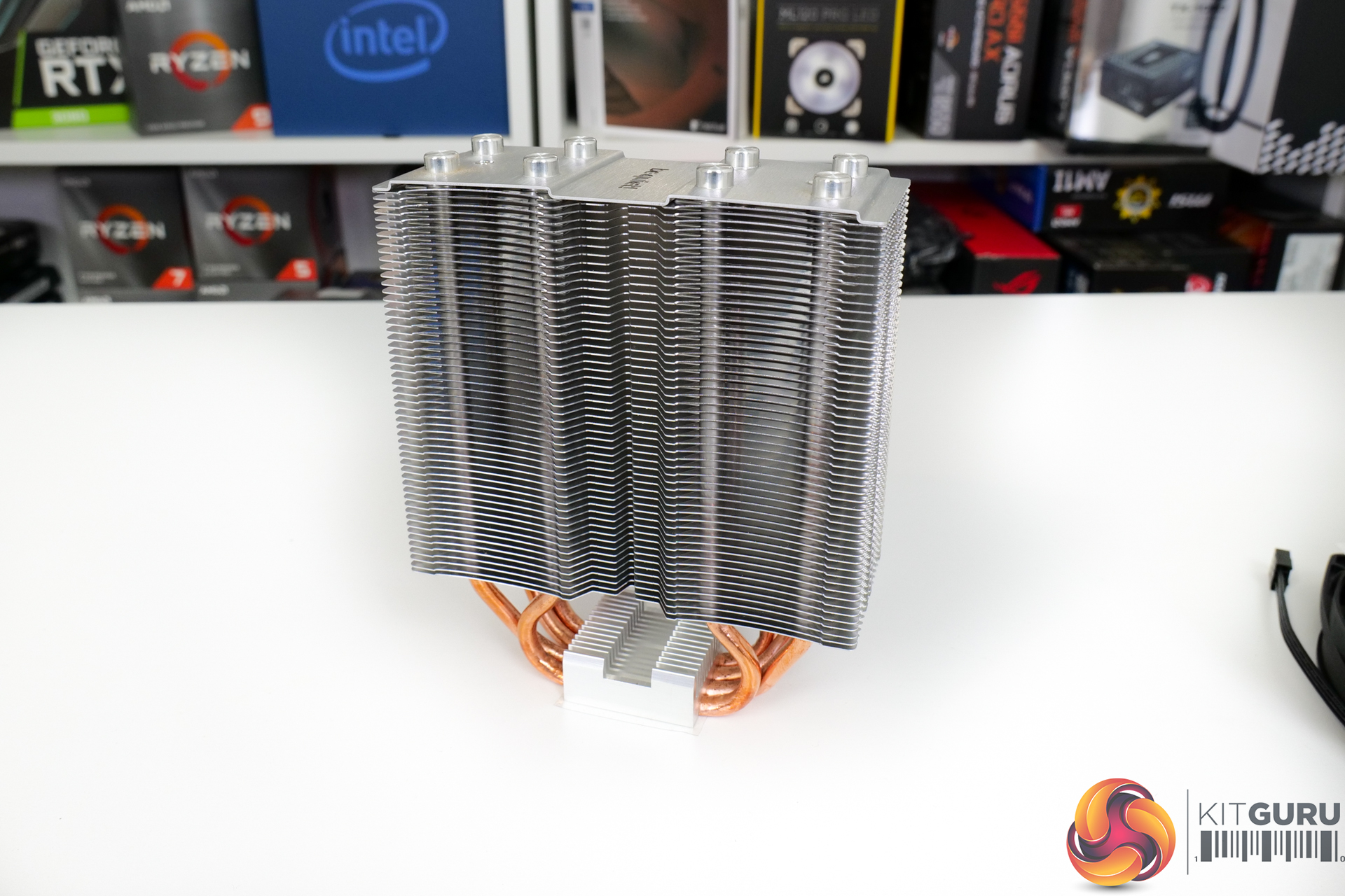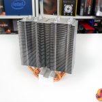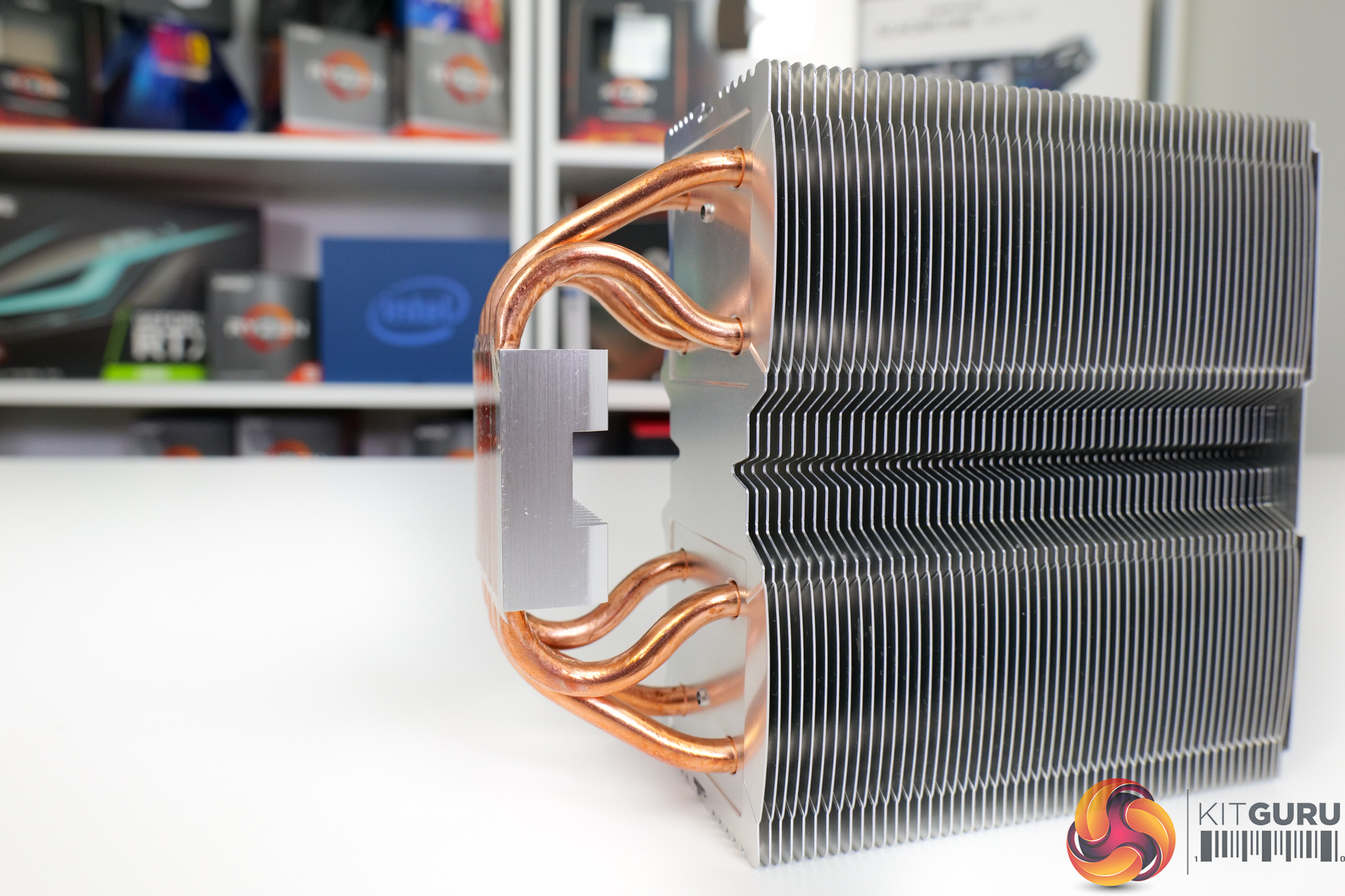Running through the aluminium fin array are four 6mm diameter copper heatpipes that come from the Heatpipe Direct Touch (HDT) base. As we would expect from a single tower heatsink, these are mounted in a U-shaped orientation. Two heatpipes position towards the front side of the fin array, and two towards the rear – at different positions behind the fan of course.