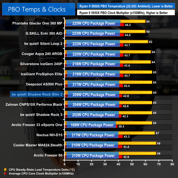And if you are interested in stock results, the be quiet! Shadow Rock Slim 2 recorded a temperature delta of around 33C for 128W package power cooled. That is pretty much identical to the Zalman CNPS10X Performa Black in terms of temperature.