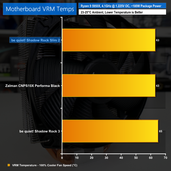 Even with VRM temps passing 70C under the heavier 209W PBO load, we have no cause for concern with the ability of be quiet!’s Shadow Rock Slim 2 to provide airflow around the CPU socket for motherboard cooling.