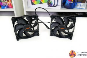 A Fluid Dynamic Bearing and 6-pole fan motor provide mechanical abilities. According to be quiet!, the fans are rated for a 300,000 hour lifespan.