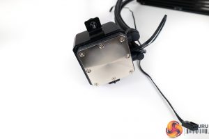 Large physical sizing is a clear trait for the pump-block unit. This houses the 2800 RPM, 3-pin power pump which features limited DC control ability. The manual highlights that DC-control voltage should be kept between 9V and 12V, but this control is dependent upon your motherboard fan header control abilities (which are generally good for modern boards).