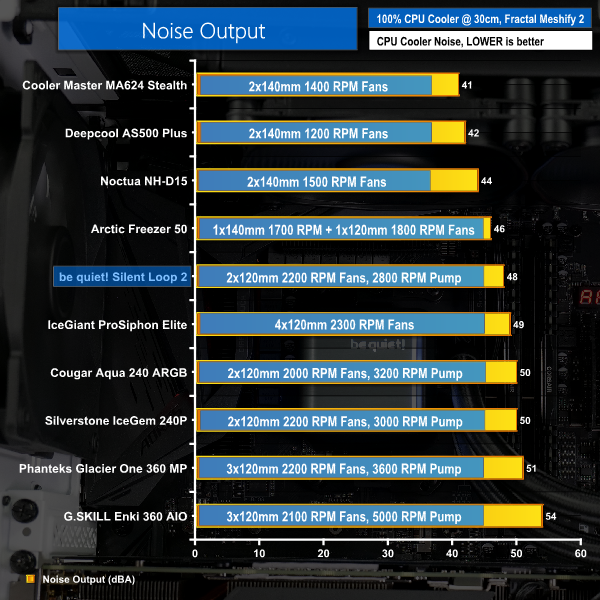 be quiet!’s Silent Loop 2 makes a promising start in the noise performance test with its two Silent Wings 3 PWM fans measuring 48 dBA at 12 inches from the chassis side panel. This is a strong result, especially given the 2200 RPM full speed operation of the 120mm blowers.