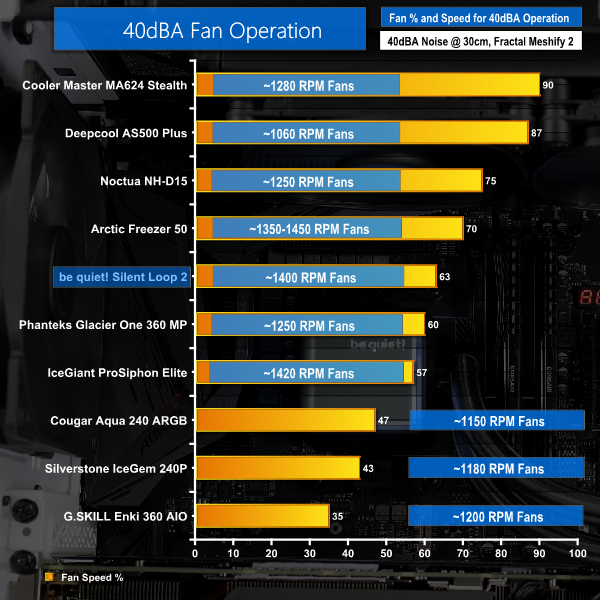Dropping the Silent Loop 2 cooler’s pair of Silent Wings 3 120mm PWM fans to 63% speed achieves our desired 40dBA target. This translates into an operating speed of around 1400 RPM for both fans with the 3-pin powered pump unit still locked at 2800 RPM.