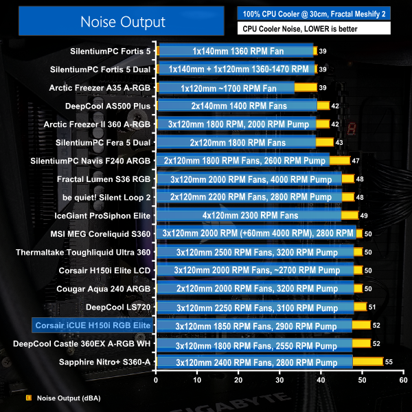 Running at 52 dBA full noise output, the Corsair iCUE H150i RGB Elite certainly isn’t a quiet CPU cooler. In fact, with those triple-fans blasting air, it is one of the loudest coolers that we have tested.