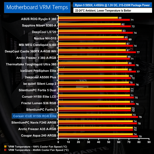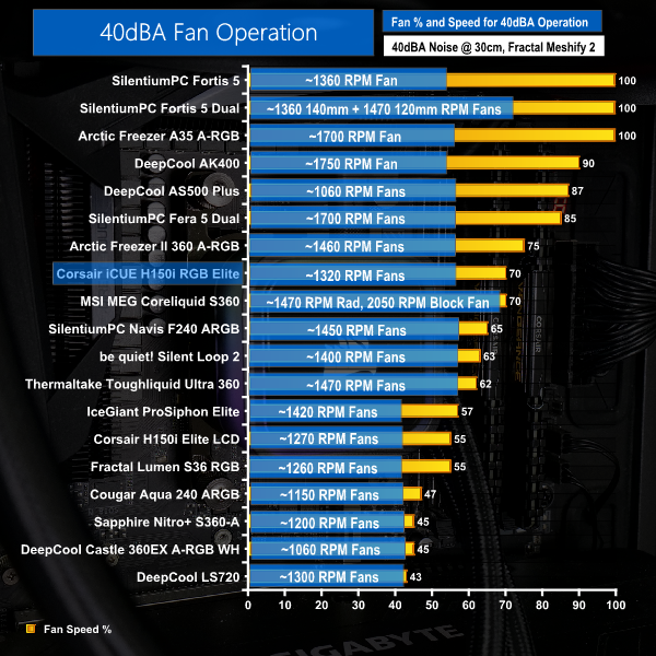 The reduction in fan speed duty cycle is less significant on the Corsair H150i RGB Elite than with some competing coolers, but the new 360mm unit still gets hit hard by the reduction to 1320 RPM fan speeds.