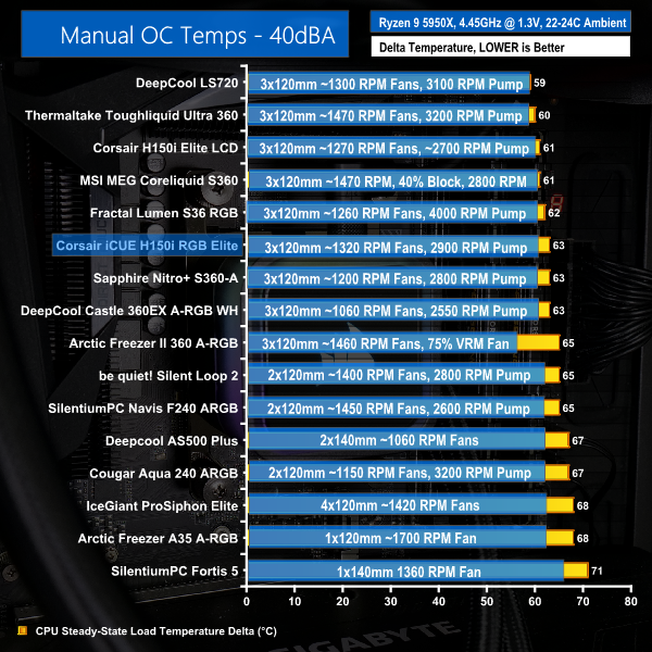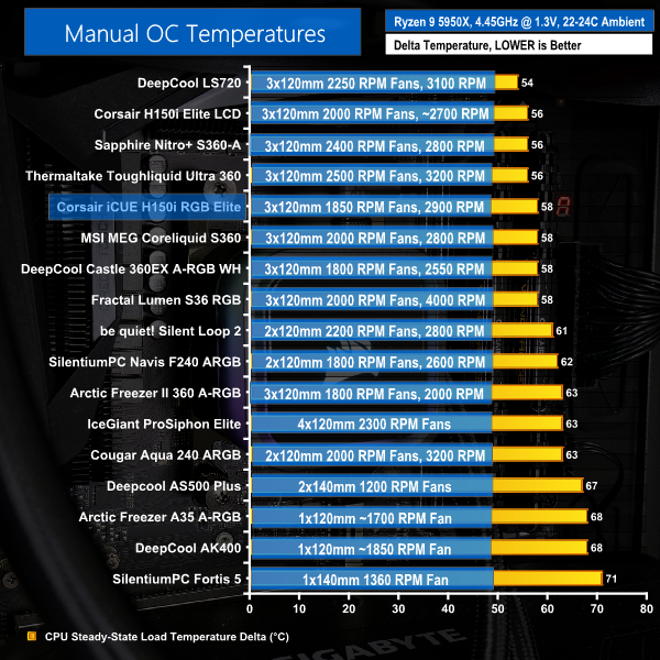 A delta temperature of 58C on our overclocked Ryzen 9 5950X is strong. This puts Corsair up against some other 360mm AIOs, notably the Asetek MSI MEG Coreliquid S360.