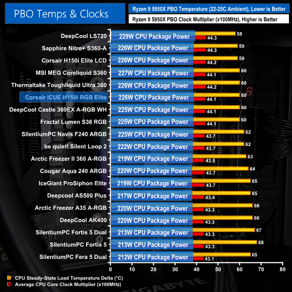 PBO sees the H150i RGB Elite falling roughly in-line with the rest of its performance showing. Corsair’s new cooler is a bit better than the DeepCool Castle 360EX and the Fractal Lumen S36, but some of the Asetek big boys will manage to squeeze out another few clicks on the core ratio multiplier.