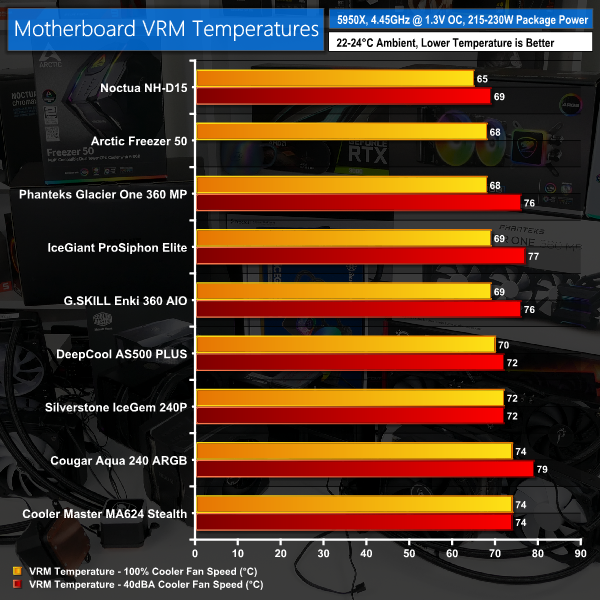 Particularly when looking at the 40dBA testing, this is where the air coolers shine versus their AIO competitors. The air coolers manage to keep VRM temperatures in the order of low-70s (though Noctua beats that). While the roof-mounted AIOs generally hit mid-to-high 70s.