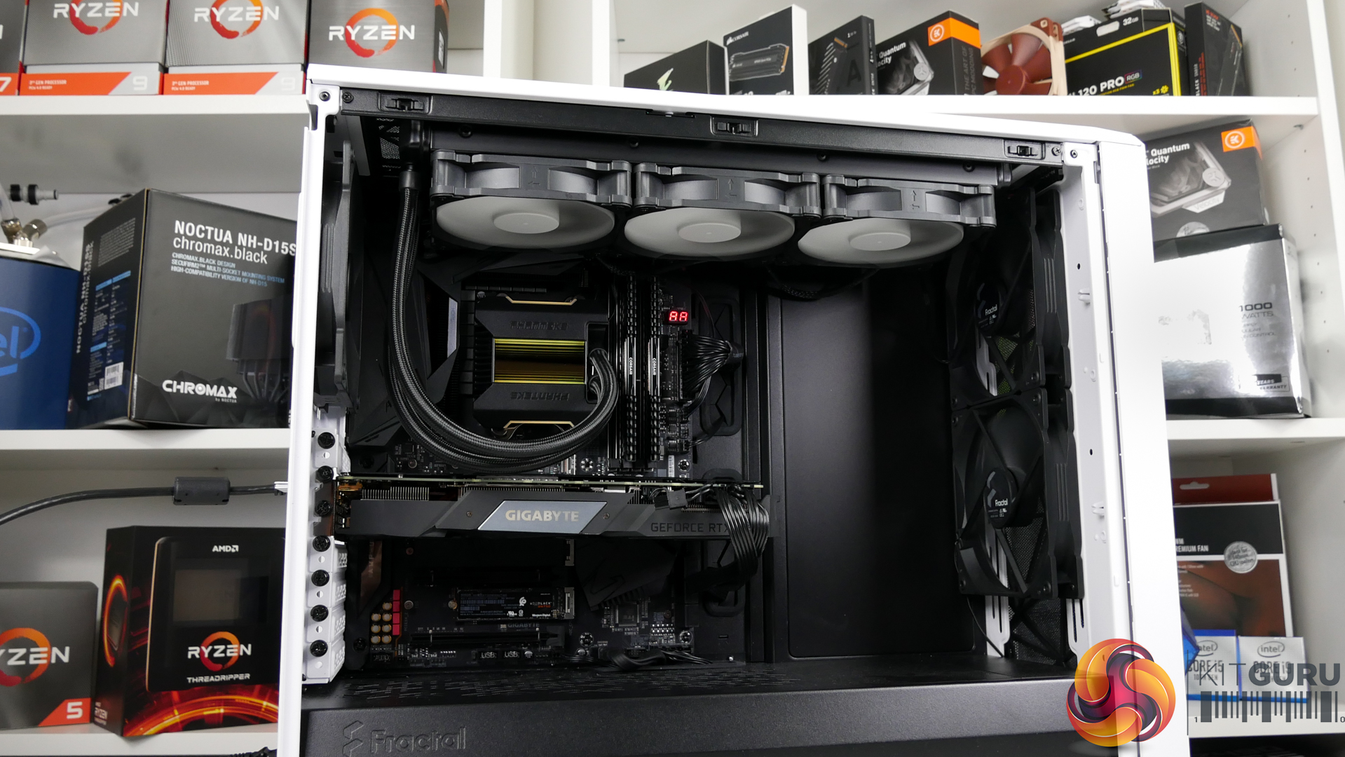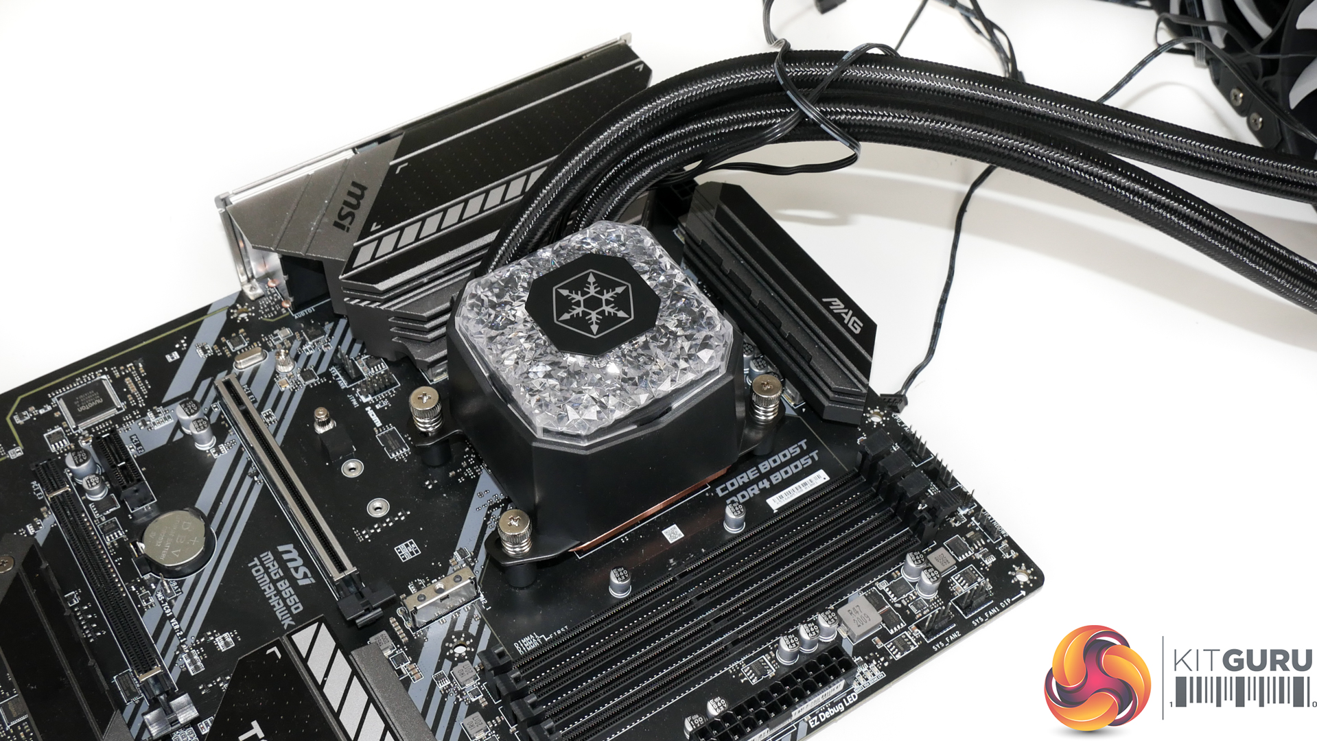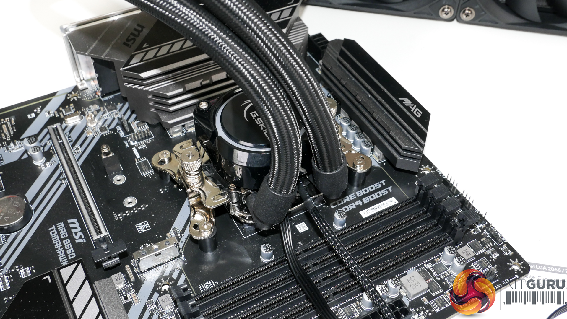 The pump-block unit then sits on the CPU and two screws are directed through its bracket to thread into the motherboard-mounted retention pieces. Annoyingly, though, G.SKILL opts for a metal washer, spring, and screw design rather than a straightforward spring-loaded screw. This makes it all more difficult as the small washer constantly moves about. Plus it looks very similar to the fan mount washers and is not segregated so it is easy to misidentify.