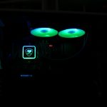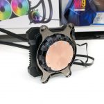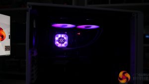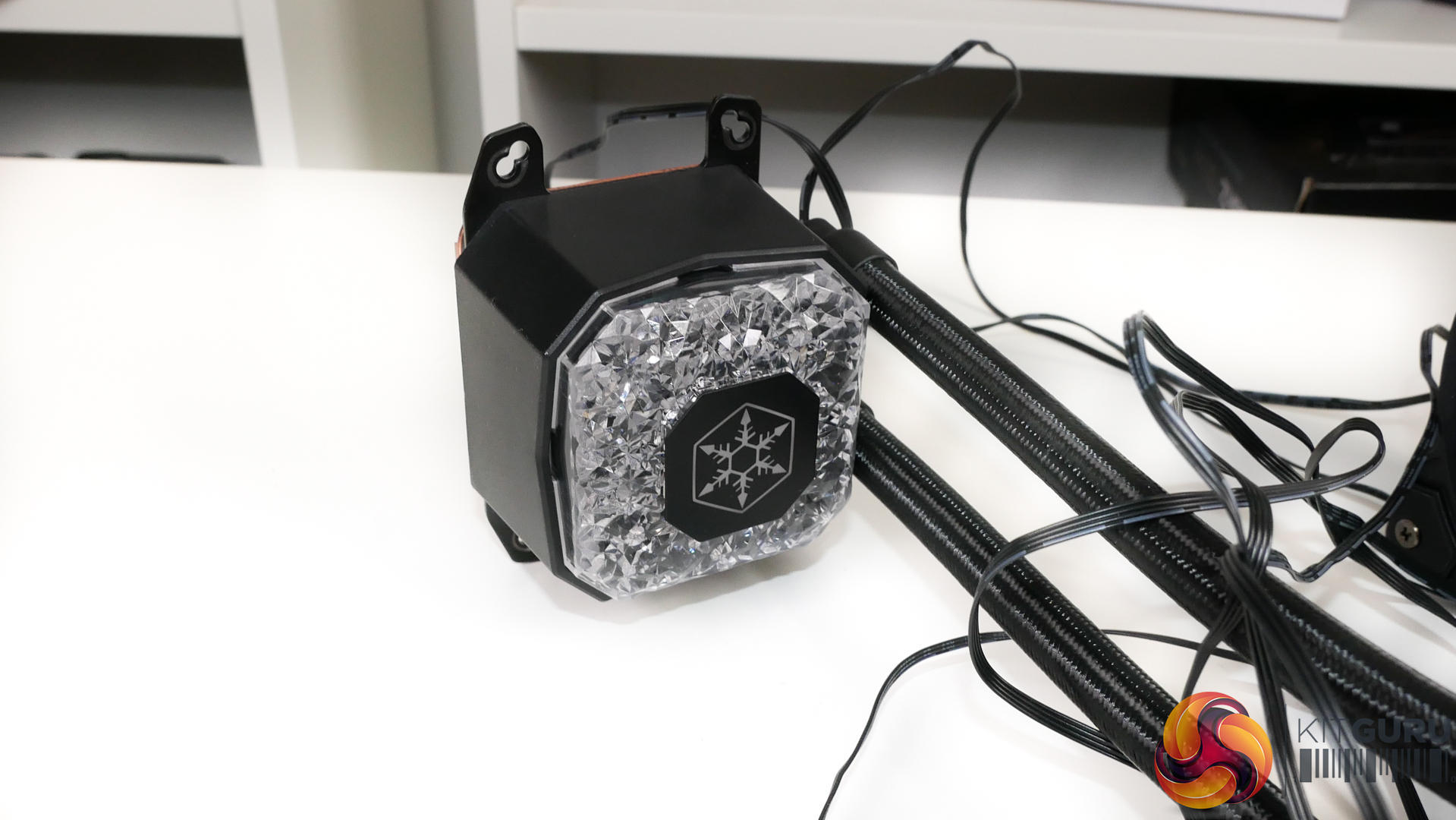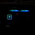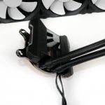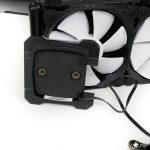 Aesthetics are strong in our opinion. The 600-2200 RPM 120mm PWM fans feature translucent white blades and smooth A-RGB lighting. And I like the diamond cut styling of the cover on the pump-block unit when lit up, though I know James was less fond.