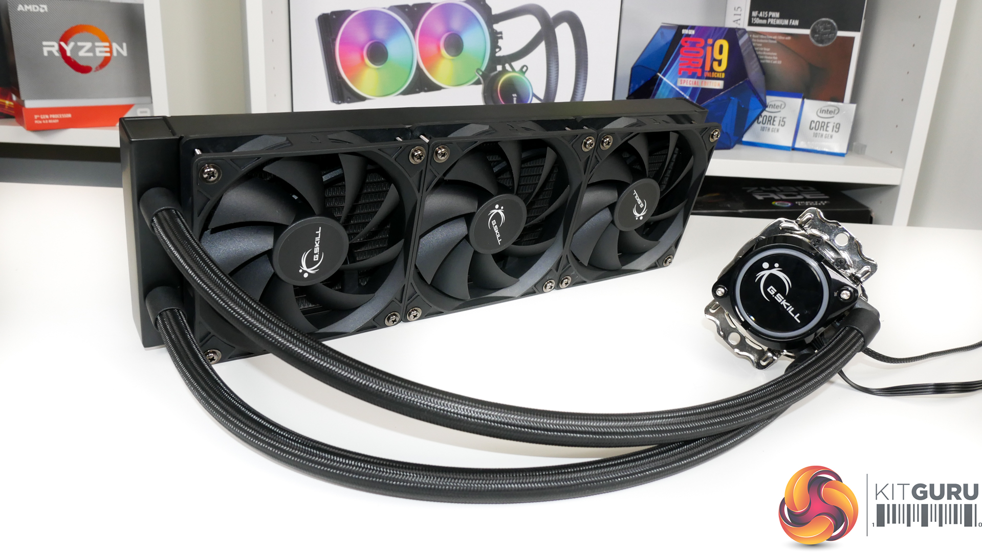 The Enki 360 AIO is a 360mm liquid cooler that represents G.SKILL’s first foray into the CPU cooling market. This 3x120mm unit features a conventional 27mm-thick aluminium radiator with a 5000RPM 4-pin powered pump unit and a convex copper cold plate.