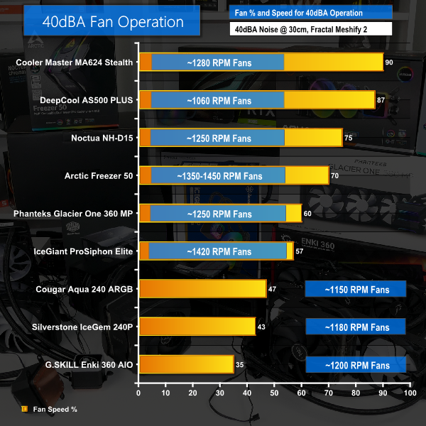 Having assessed the coolers at full fan speed, we see clear separation between the AIO cooler performance with their high-speed, loud fans and the competing lower-speed fan air coolers. As such, we have a look at some test results with the noise levels locked to 40dBA on each CPU cooler.
