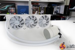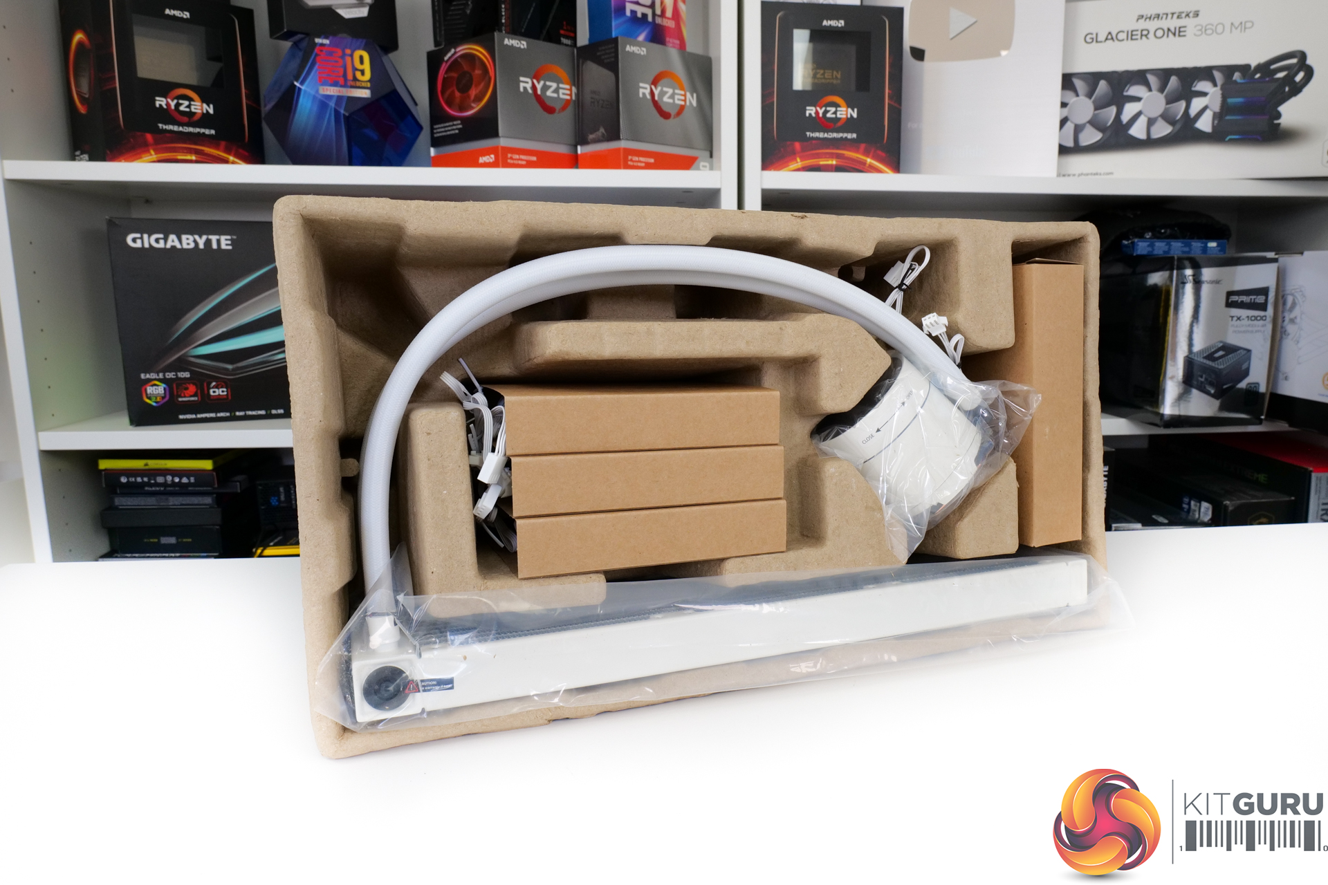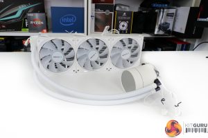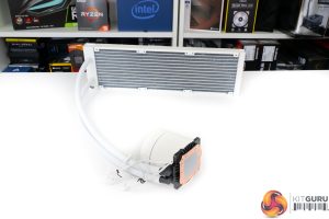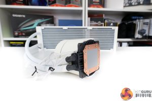 Physically, the pump-block unit is massive; it measures in at 86x75x71 mm. This is clearly not an ITX-friendly pump-block design. The overall design is cylindrical and maintains the consistent white colour scheme.