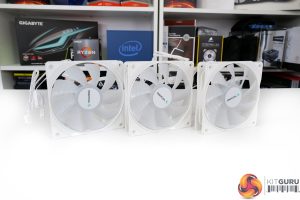 The trio of DeepCool’s CF120 A-RGB PWM fans feature an all-white housing alongside translucent blades. This maintains the white theme of the entire AIO and allows the 12 LED on each fan to shine brightly through the blades.
