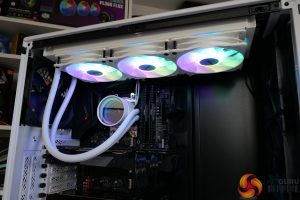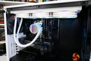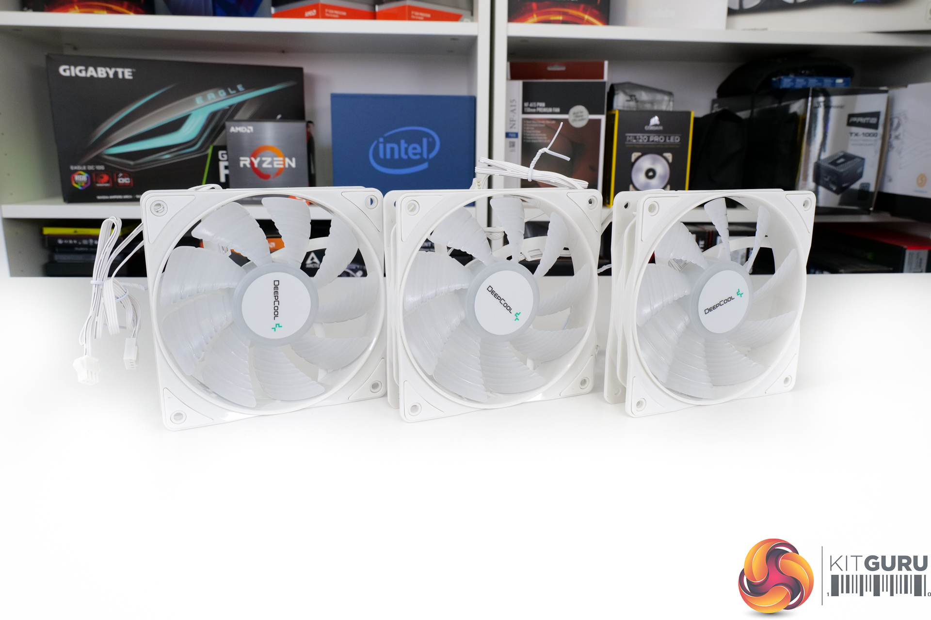 Kudos to DeepCool for (sensibly) using white colouring for the fan and LED connection cables. This – once again – helps to maintain the overall white appearance. A pair of connectors emanate from the pump-block unit and each of the 120mm fans. These are for power/speed control and RGB lighting.