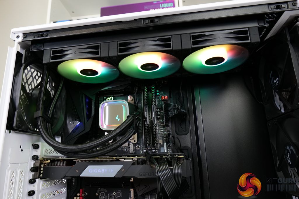 In order to get the unit running at 40 dBA, we had to reduce the three FC120 fans all the way down to 43% duty cycle or 1300 RPM from their 2250 RPM top speed. This is a huge reduction in operating speed and really emphasises just how aggressive DeepCool has been with its bias for thermal performance as opposed to tolerable noise output.