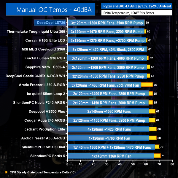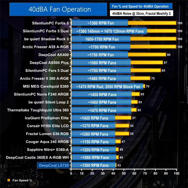 When coupled with the extremely high noise output from the LS720, it’s blatantly obvious that DeepCool is trying to brute force its way to the top of cooling charts. But that may be a tolerable solution for many users. And for those to whom it isn’t, let’s take a look at 40dBA noise-locked performance.