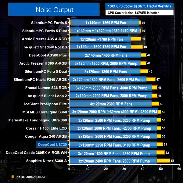 Nevertheless, DeepCool’s LS720 tops this chart and still has plenty of fan speed headroom left in the tank if you really need a surge in cooling performance. That’s pretty impressive.