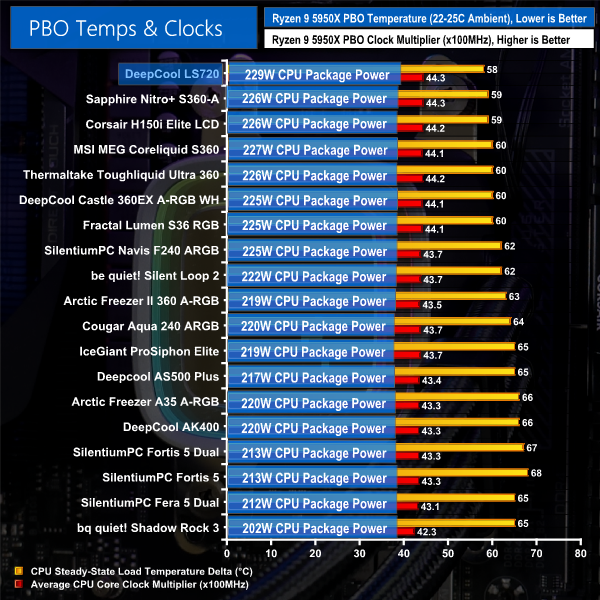 Just shy of 230W of AMD CPU package power handled by the DeepCool LS720 is an outstanding cooling result, even if the 100% fan speed noise output is very high.