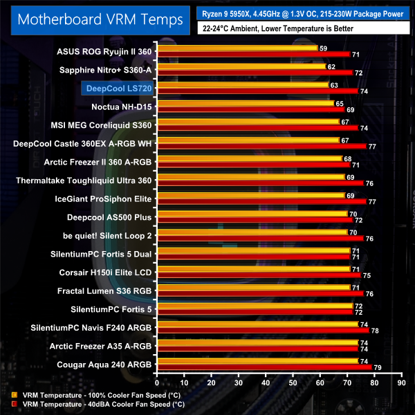 The result isn’t so positive when locked to 40dBA, as a multitude of other coolers are more competitive. Either way, though, there’s no cause for concern with VRM temperatures even with the LS720’s fan speeds constricted.