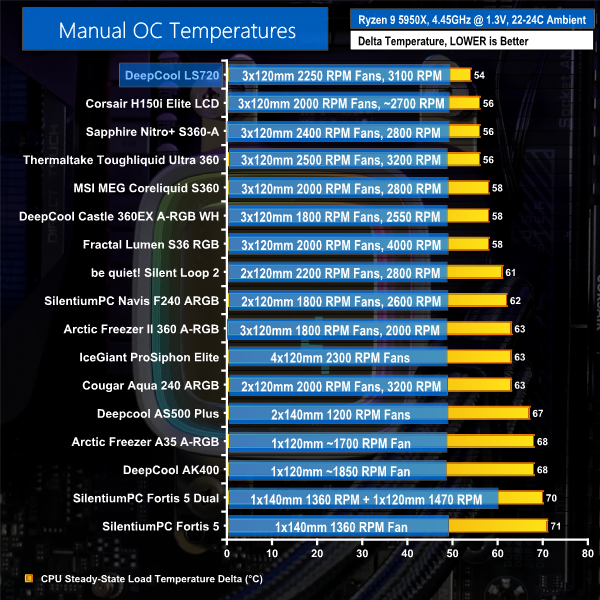 Super high noise output may bring acoustic irritation, but it certainly doesn’t irritate when it comes to all-out cooling performance. Put simply, the DeepCool LS720 is a liquid cooling powerhouse on our overclocked Ryzen 9 5950X test system.