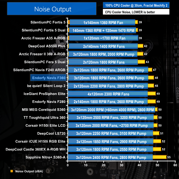 So, that final point, highlights that there is clearly headroom to ramp up the fans without adding too much more noise stress compared to some other 360mm AIOs.
