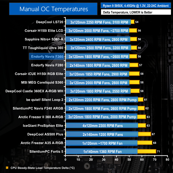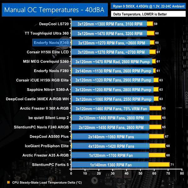 Once again, we see very strong performance from the Navis F360 that indicates its ability to compete with some of the market’s premium 360mm AIO offerings.
