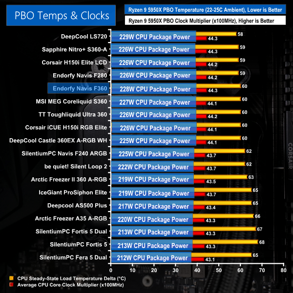 Switching back to full fans speeds and with the processor running in Precision Boost Overdrive mode, we continue to see strong performance from the Endorfy Navis F360. While the recorded temperature is slightly higher than some of the AIO comparisons, this is not really a clear indication of PBO performance. And that is because the 360mm AIO does very well in terms of recorded CPU frequency and the package power handled.