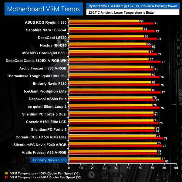 VRM cooling performance is poor, though. This may be due to the mounting location with respect to concentration of the fans’ airflow. Whatever the reason, our test system did not fair well for VRM thermals when used with the Navis F360.