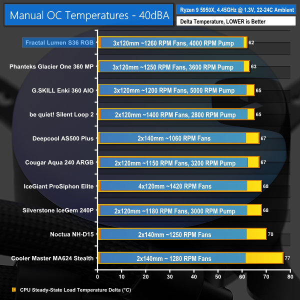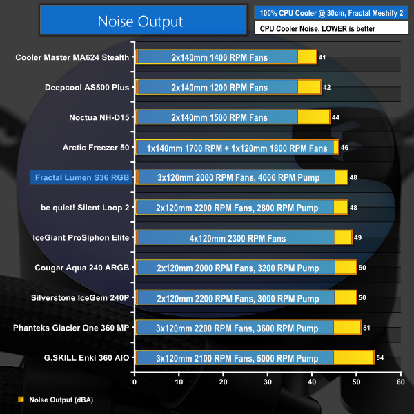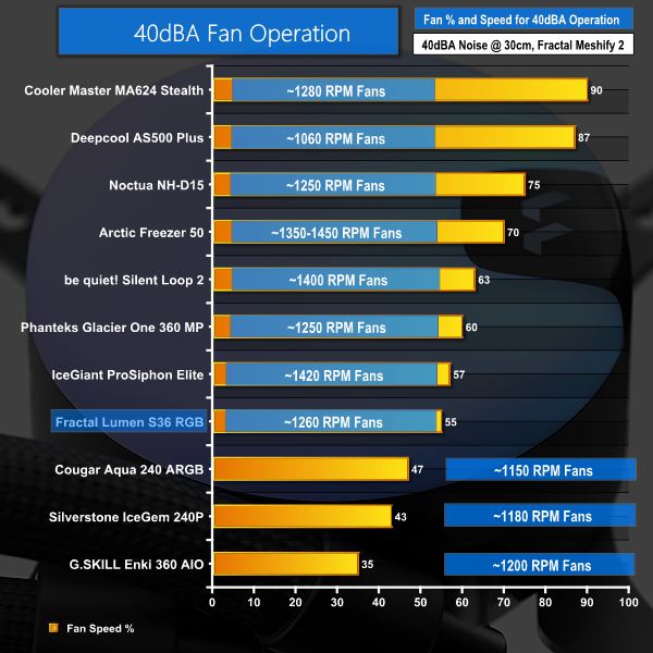 Despite losing slightly more of its fan speed percentage versus the other AIOs, Fractal's Lumen S36 RGB locked at 40dBA noise output delivers excellent cooling performance.