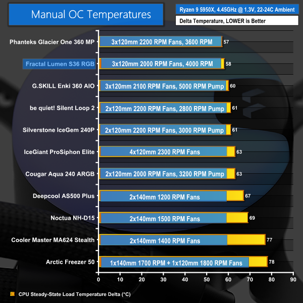 Based on full fan and pump speed performance, the Fractal Lumen S36 RGB is an excellent choice for our heavily overclocked Ryzen 9 5950X test processor.