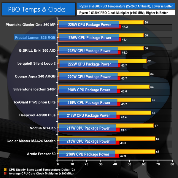 The same exceptional cooling performance continues with our PBO test. This time, the Fractal cooler manages the same power cooled as the Asetek Phanteks competitor, but it is behind on the CPU clock measure by a very slim margin.