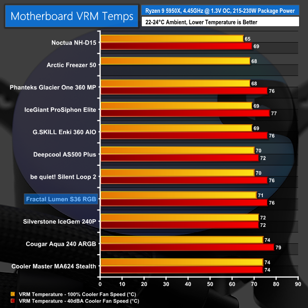 VRM cooling is simply mediocre and is nothing to be particularly impressed by. With a test system similar to ours, the Fractal AIO should provide enough incidental airflow to keep the VRM sufficiently cooled.