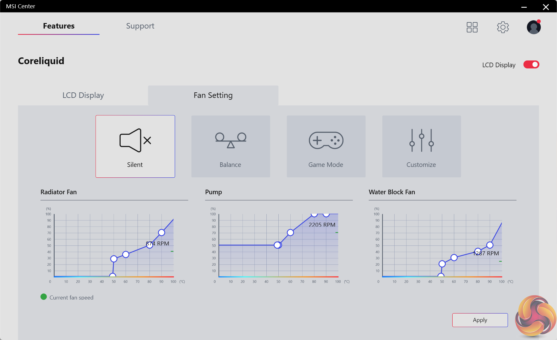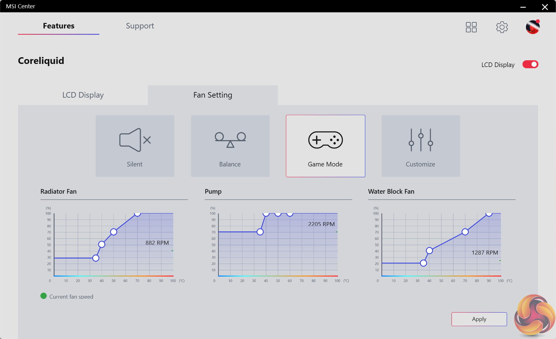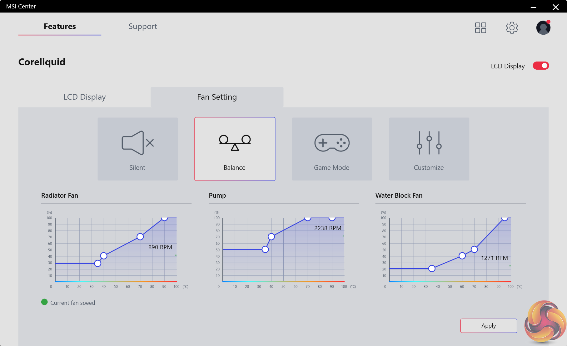 The pump unit is PWM controlled and operates up to 2800 RPM top speed. Its speed curve can be controlled within MSI’s Windows software.