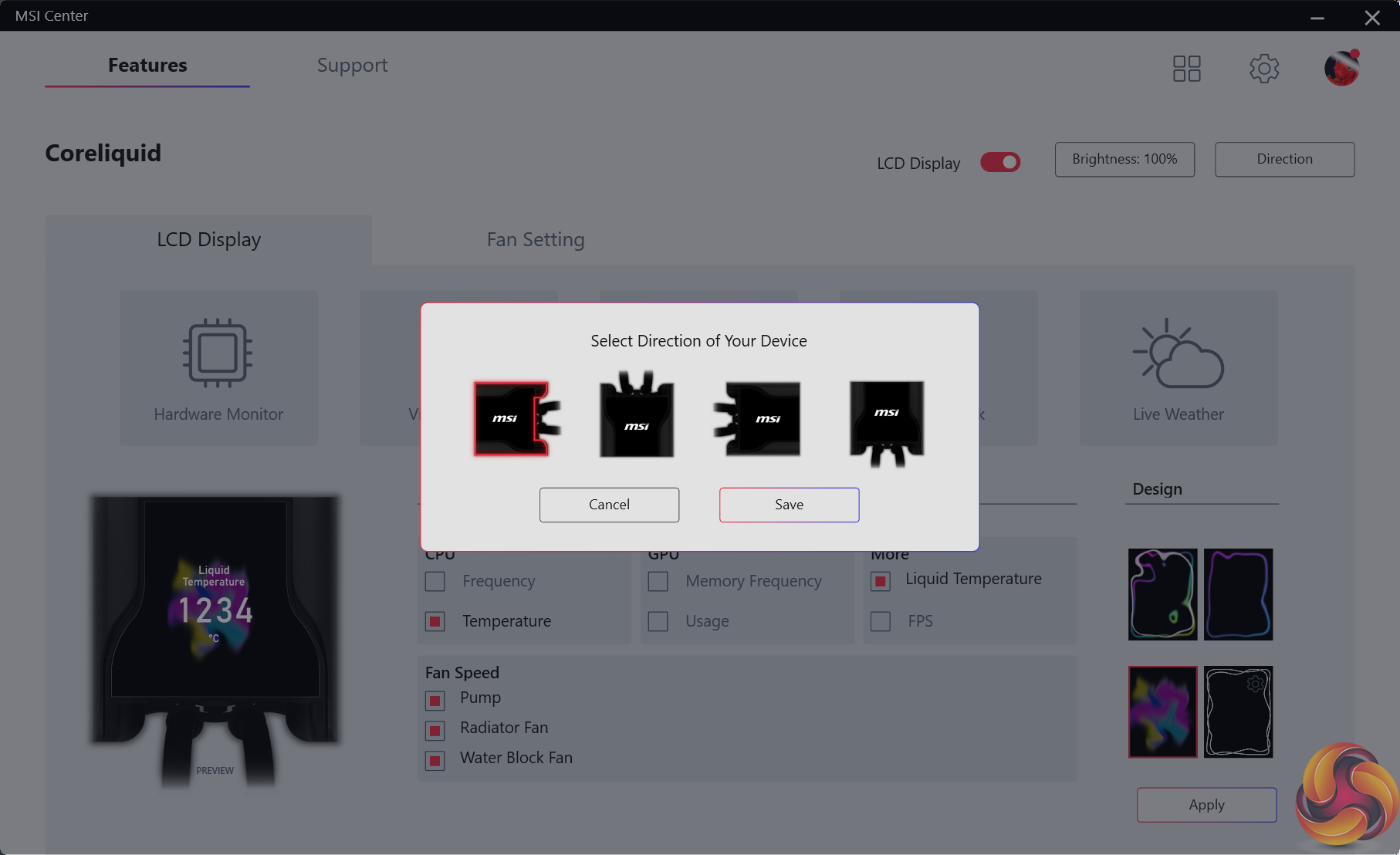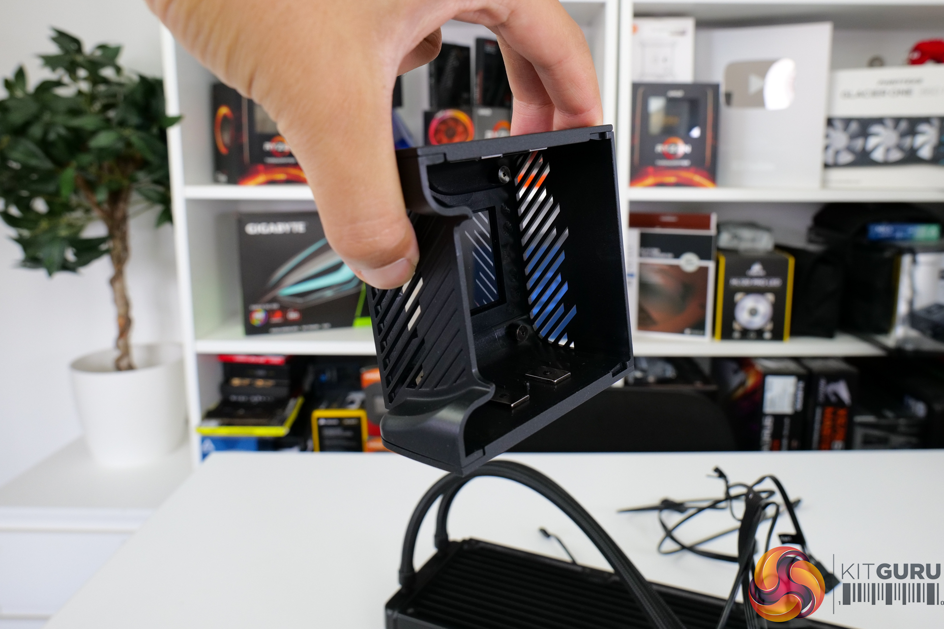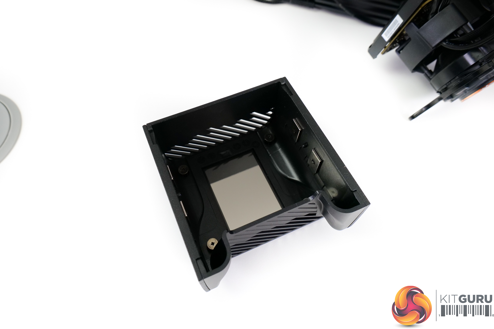 The 2.4” IPS display is fastened to the pump-block unit and has a very large, magnetically-held cover sitting atop it. This cover is designed to allow ventilation for the 60mm fan whilst also hiding the connectivity cables and projecting the screen’s image. It does, however, severely limit the angles of the tubing entering the block.