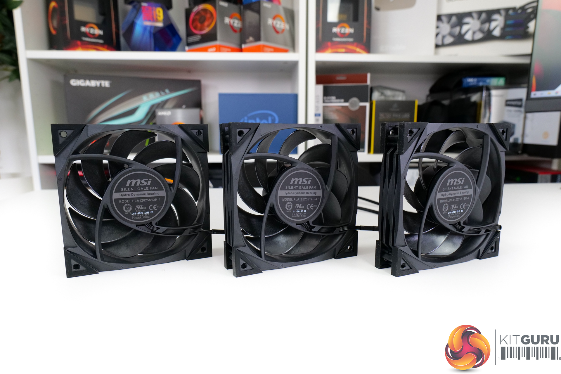 MSI’s choice of fans is a trio of the MEG Silent Gale P12, which are intended for noise-efficient cooling according to MSI. These hydro-dynamic bearing 120mm blowers operate at up to 2000 RPM top speed.