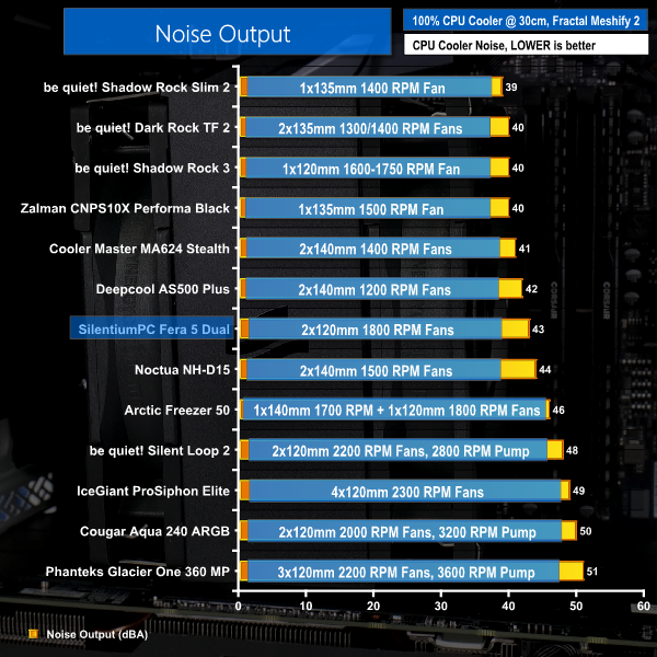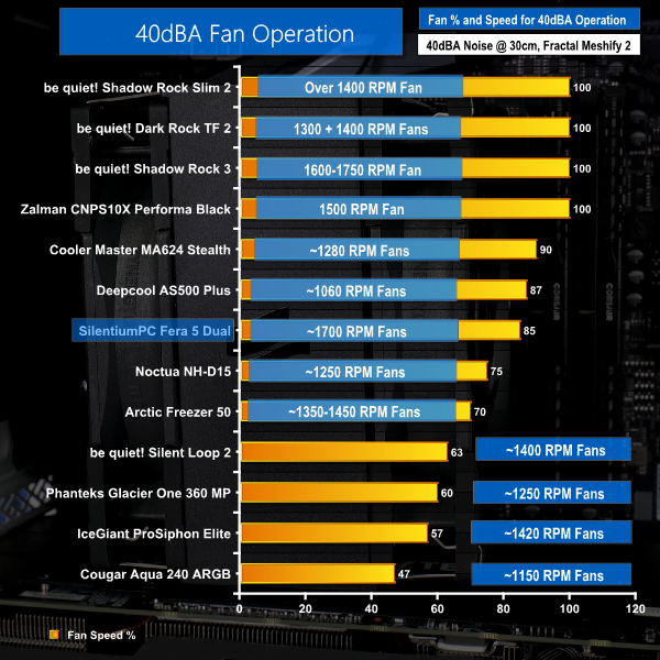 This puts the Fera 5 Dual about mid-table in terms of how close it can get to full fan speed whilst hitting 40dBA.