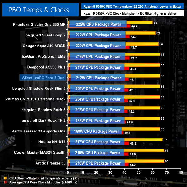 Let’s start by looking at Precision Boost Overdrive test results. With 90C the maximum target temperature for PBO, we are looking at how the cooler achieves the balance between lower temperature operation and higher PBO clock speeds. Higher clocks with lower temperatures are better. But one cooler may run at slightly higher temperatures than another, albeit with higher clock speeds, so look out for that.