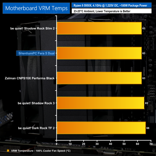 VRM cooling proficiency was also positive. This is an interesting one, as the larger dimension fans of the competing 135mm coolers should provide greater incidental airflow to the motherboard VRM heatsink. But the SilentiumPC Fera 5 Dual still managed to match the VRM cooling performance shown.