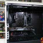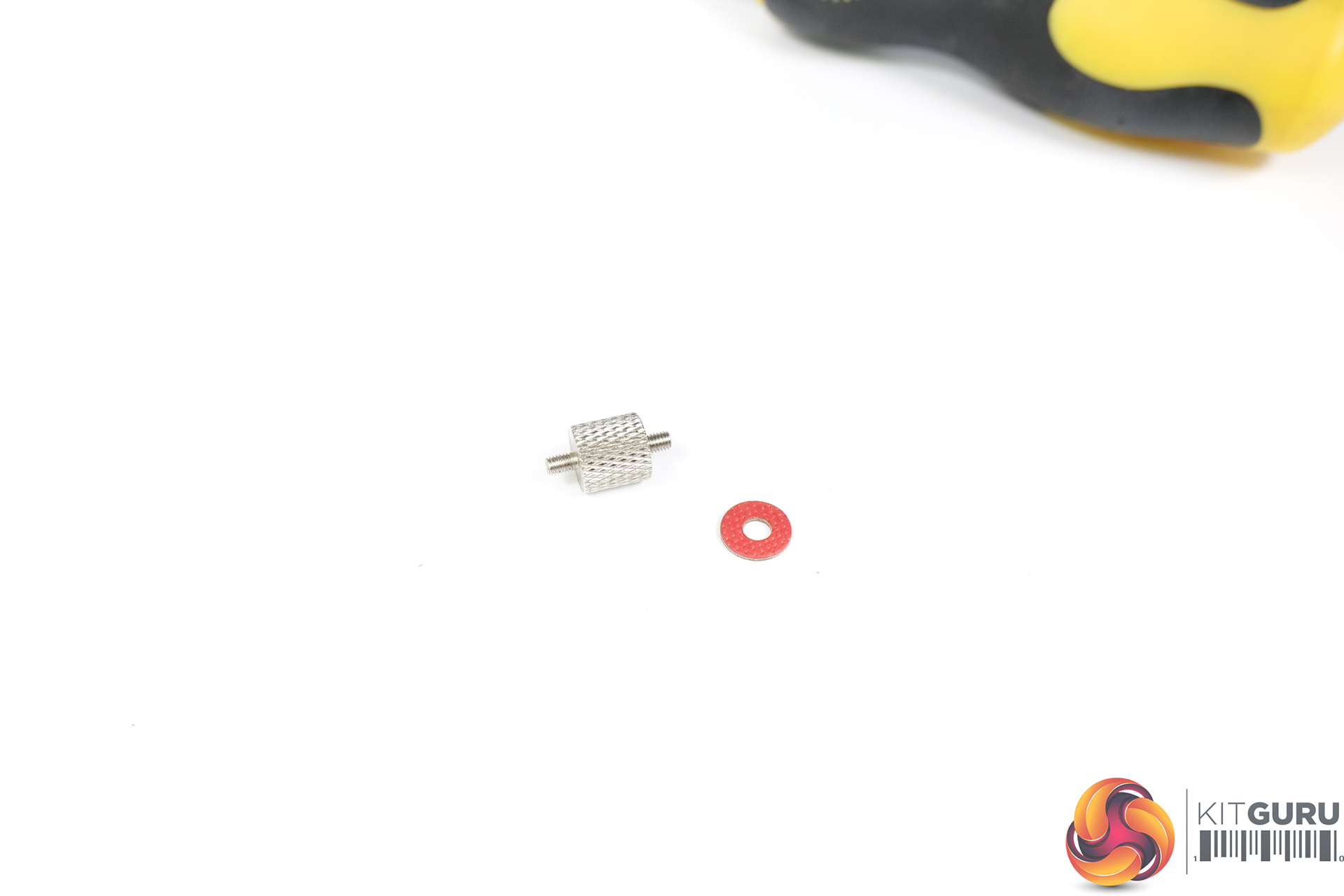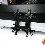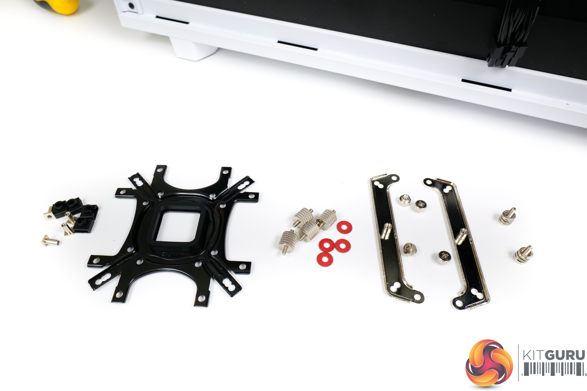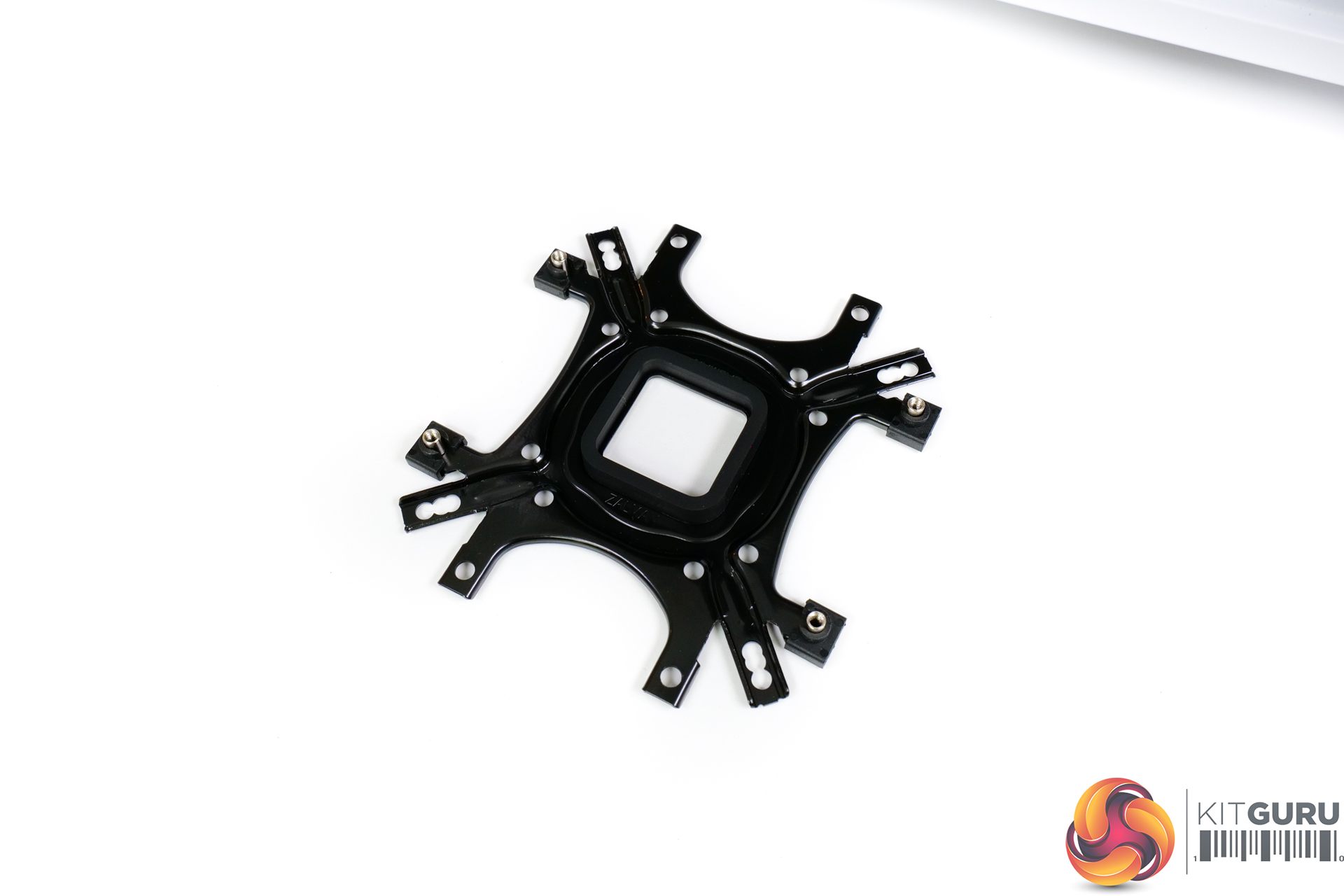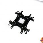 Once the backplate rubber space is stuck on, the bracket can be positioned on the motherboard. Washers and 4 individual stand-offs then hold the backplate in place. This is an OK procedure as long as you have one hand round back and then one hand messing with the washers and stand-offs.