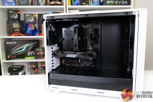 The fan configuration is the three included Fractal Dynamic X2 GP-14 fans spinning at full 1000 RPM speed. In addition to the two 140mm front-mounted fans, and single 140mm rear exhaust, we added a be quiet! Pure Wings 2 1000 RPM 140mm fan as roof exhaust for air cooler testing. The aim here was to keep consistency with the airflow path of the liquid coolers which are always roof mounted.