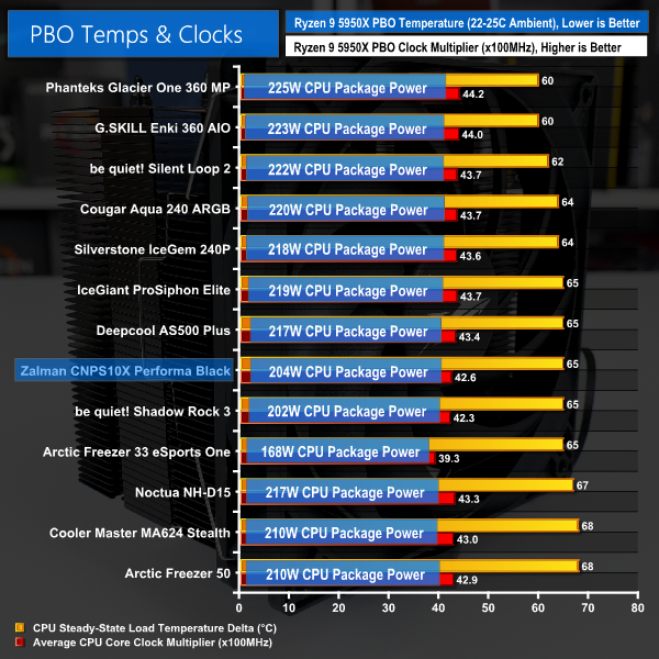 Zalman’s CNPS10X Performa Black manages to cool 204W of CPU package power from our Ryzen 9 5950X. This translates into an average CPU clock speed of 4260MHz. By comparison, the slightly more expensive and marginally lower noise be quiet! Shadow Rock 3 tolerates 202W of cooling that translates into 4230MHz average clock speed.