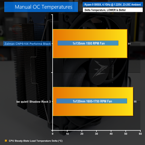 With the Zalman and be quiet! coolers directly compared in a fixed frequency scenario, the CNPS10X Performa Black comes out on top. Zalman’s sub-£40 cooler manages a delta temperature of 51C whereas the more expensive but slightly lower noise be quiet! competitor is around 4 degrees hotter running.