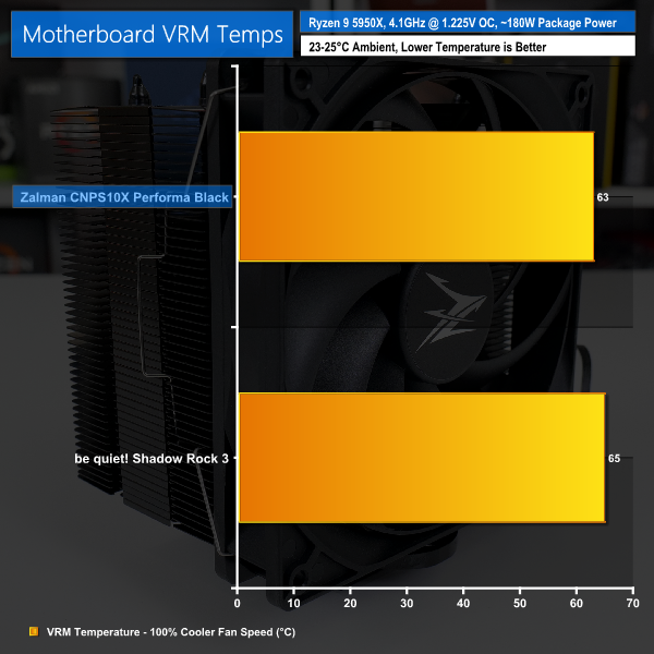 Checking the VRM temperatures for our overclocked cooling run, we see that the 135mm fan used by Zalman is perfectly competent in providing incidental airflow. Less than 70C on the VRM temperature sensor of our Gigabyte motherboard is nothing whatsoever to be concerned about.