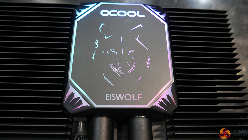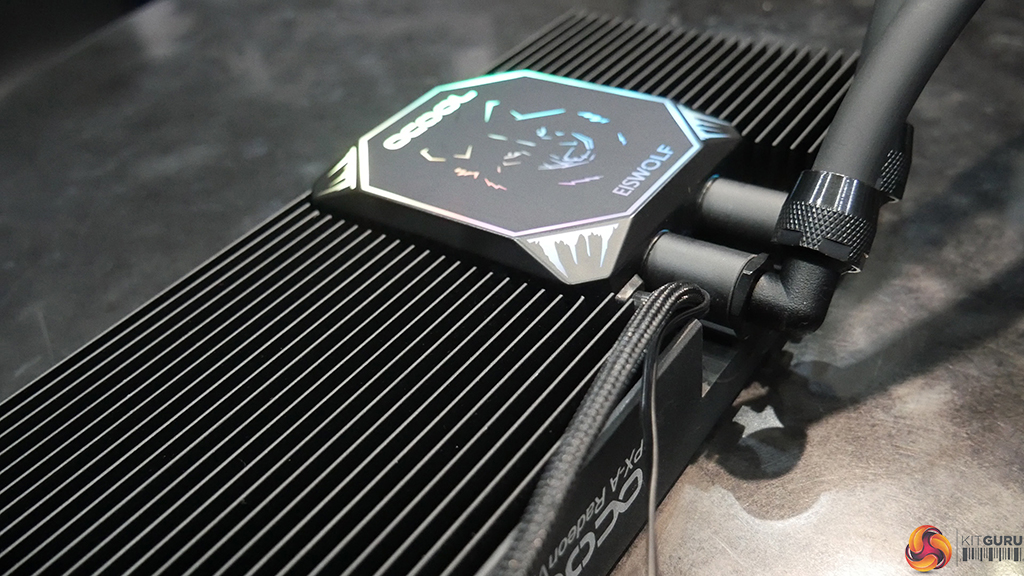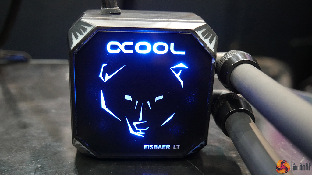 One of the big themes this year is that Alphacool is now adopting RGB. This can be seen in a bunch of new products, including the new XPX Aurora CPU blocks, the Eisball reservoir/pump combo unit, the Eiswolf GPU all-in-one liquid cooler and the new Eisbaer CPU AIOs.