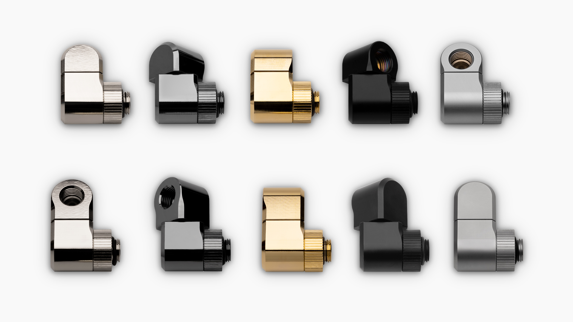 EK also has new double-rotary offset fittings on the way in 21mm and 28mm variants. Both will be available in all the finishings EK offers, including Nickel, Black Nickel, Black, Satin Titanium and Gold. These new fittings will be particularly important for those looking to build a loop with a distro plate, as you can align ports on the GPU water block with the distro plate using a single fitting, instead of combining angled fittings and extenders.